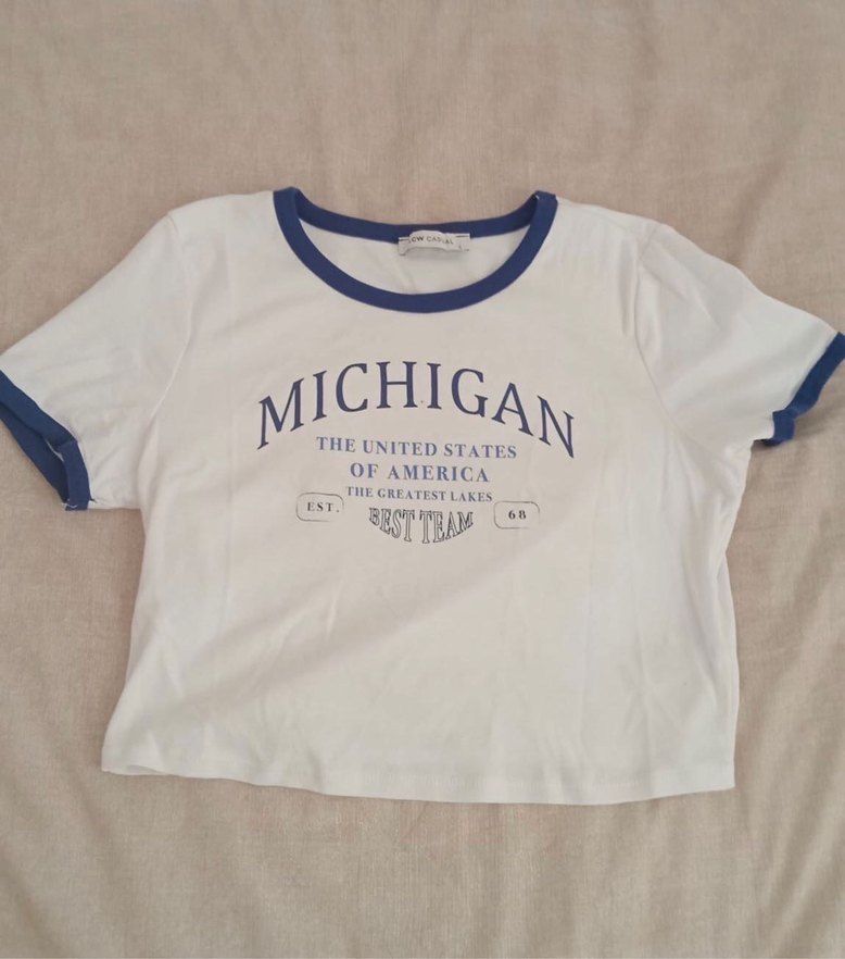 Pamuklu, kısa kollu, yuvarlak yaka beyaz tişört. Gri tonlarda Michigan baskısı ve rahat kesimiyle günlük sokak modasına uygun. ️