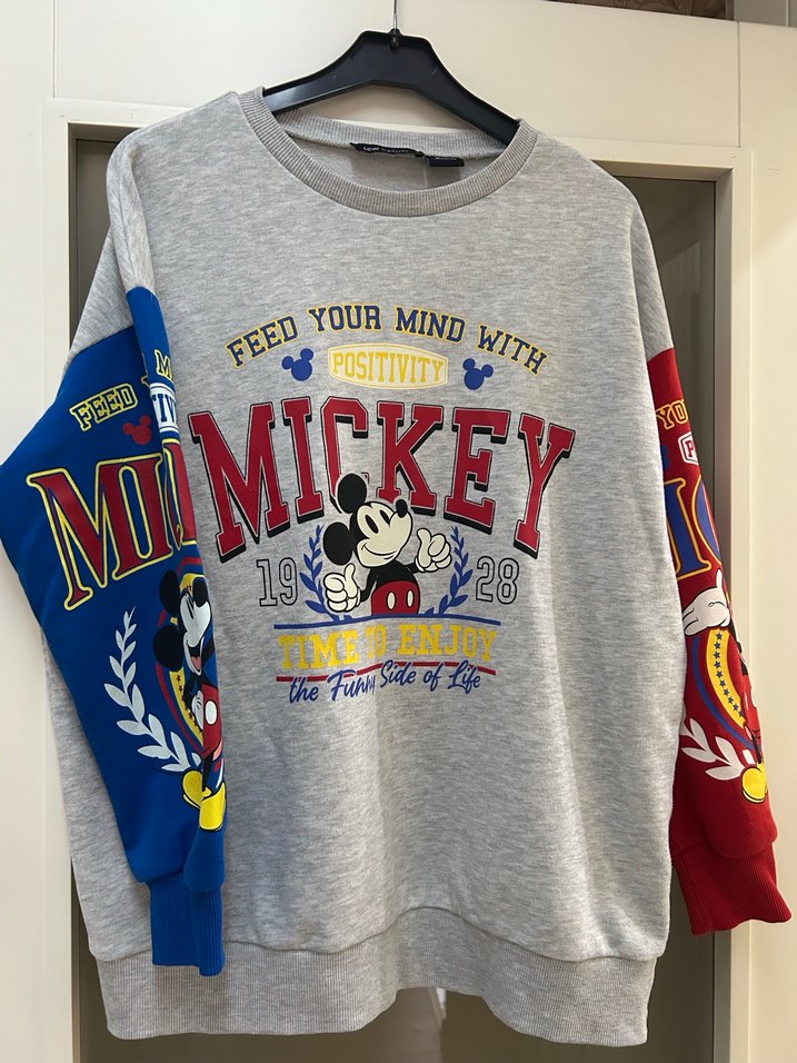 Pamuklu, uzun kollu gri oversize sweatshirt, renkli Mickey baskılı kollara ve rahat kesime sahiptir. Önde pozitif yazılar ve örgü dokusu , S beden ama L bedene kadar uygun, çok az kullanılmış, çok iyi durumda.