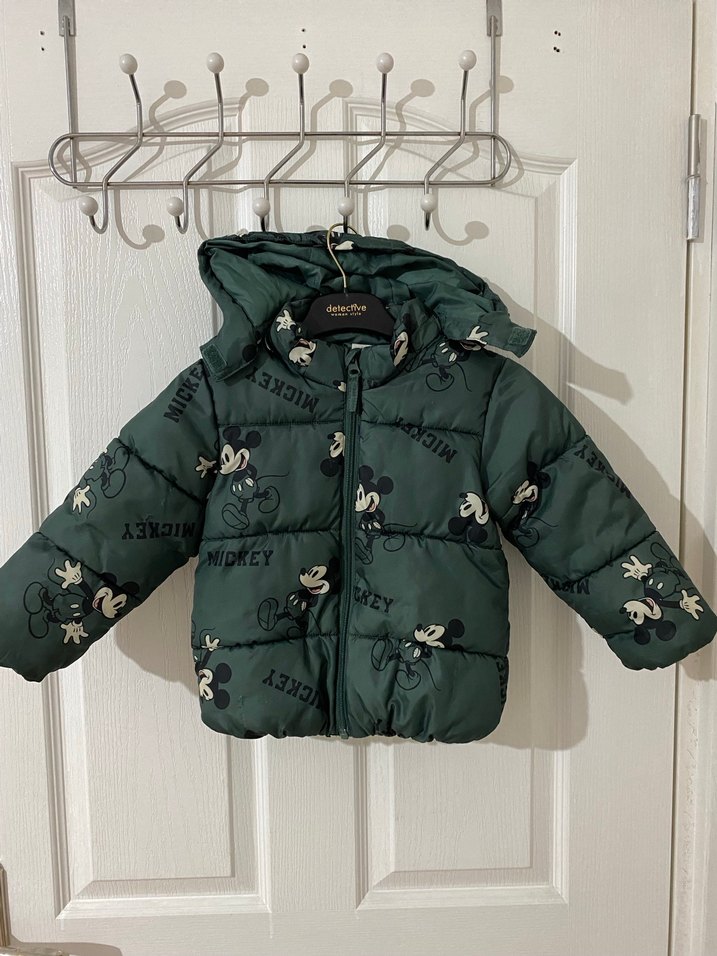 Koyu yeşil, kapüşonlu ve baskılı Mickey Mouse desenli, erkek çocuklara özel dar kesim kaban. Yumuşak ve sıcak kumaştan, kürk detaylıdır. Sokak modası tarzında.