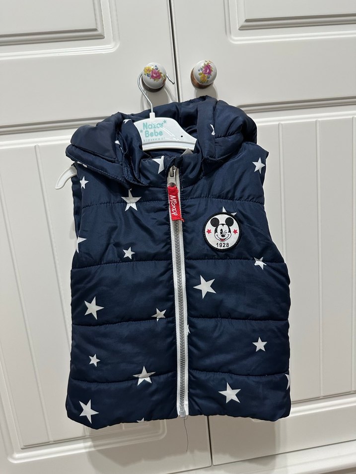 Bu dar kesim, kolsuz yelek mavi kumaş üzerinde yıldız desenli, önü fermuarlı ve Mickey Mouse patch detaylıdır. Kapüşonludur, rahat sokak stili için uygundur.
