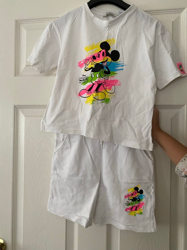Pamuk kumaştan, kısa kollu ve bol kesim beyaz kız çocuk takımı. Üstte ve şortta renkli Mickey Mouse baskısı bulunur, rahat ve şık bir tarz sunar.
