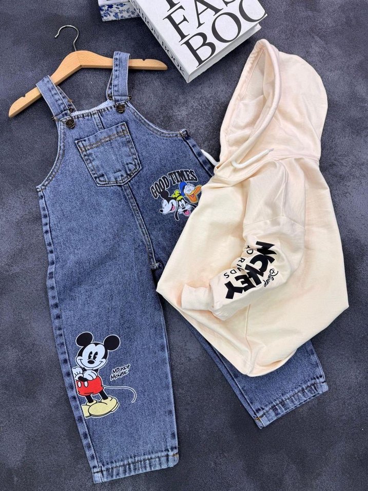 Pastel mavi renkli, işlemeli Mickey figürlü, düğmeli kolsuz denim tulum ve krem kapüşonlu Mickey baskılı sweatshirtten oluşan bebek erkek seti.