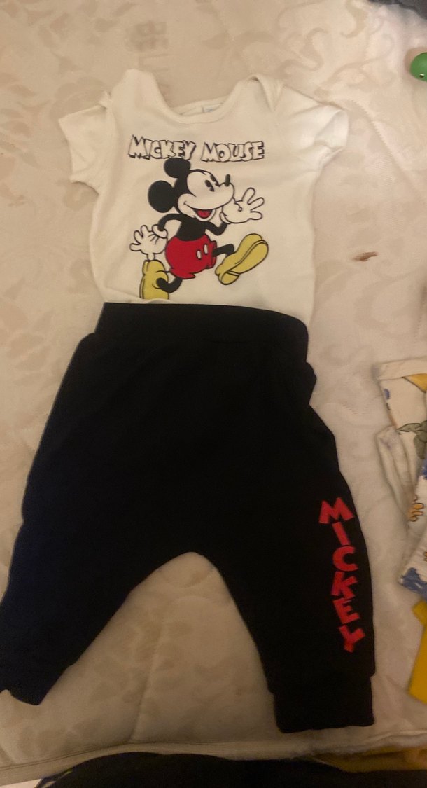 Kısa kollu, beyaz pamuklu üstte baskılı Mickey Mouse figürü bulunur. Alt kısmı koyu renkte, cırt cırtlı ve kırmızı "Mickey" yazılıdır. Sokak stilinde bir bebek kıyafet seti.