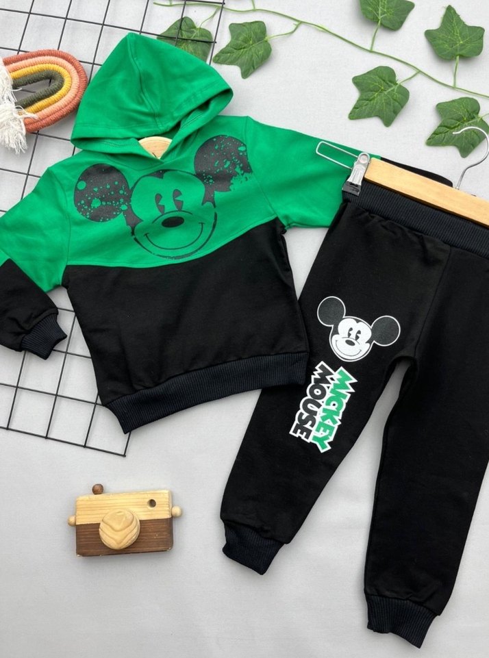 Erkek çocuklar için yeşil-siyah renkli, Mickey Mouse baskılı, bol kesim ve yumuşak kumaşlı eşofman takımı. Kapüşonlu üst ve cırt cırtlı pantolon içerir.