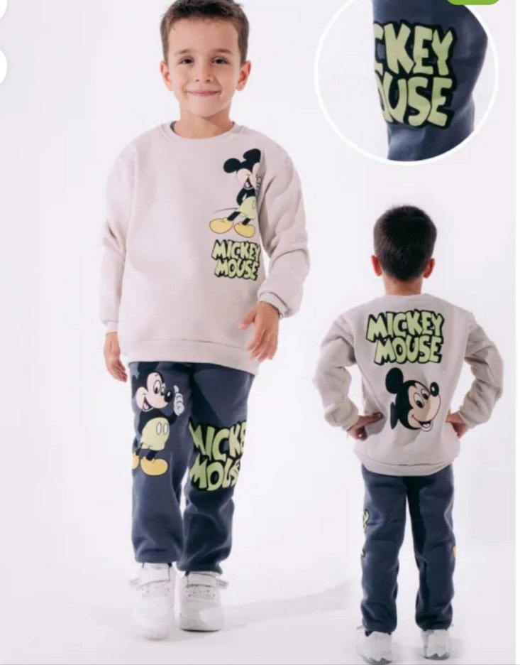 Beyaz renkli, pamuklu sweatshirt ve gri baskılı eşofman altından oluşan, Mickey Mouse baskılı, rahat kesim erkek çocuk eşofman takımı. Velcro detaylıdır. şardonlu kışlık. 9/10 yaş. marka temsilen yazıldı