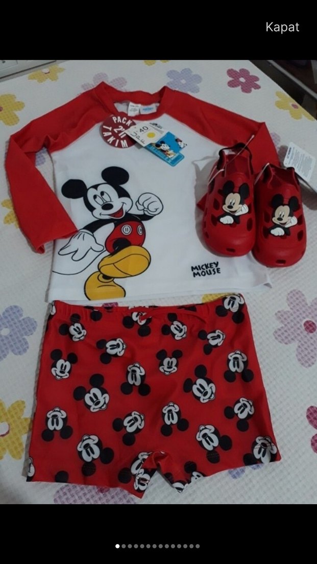 Kırmızı ve beyaz kısa kollu üst, Mickey Mouse baskılı kırmızı mayo şortu ve Mickey Mouse figürlü kırmızı terliklerden oluşan renkli erkek çocuk mayo takımı. ♂️