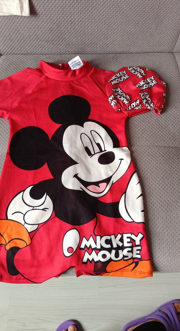 Renkli kırmızı çocuk atleti, büyük Mickey Mouse baskısı ve uyumlu baskılı şapka içerir. Yumuşak ve rahat kumaştan yapılmıştır.