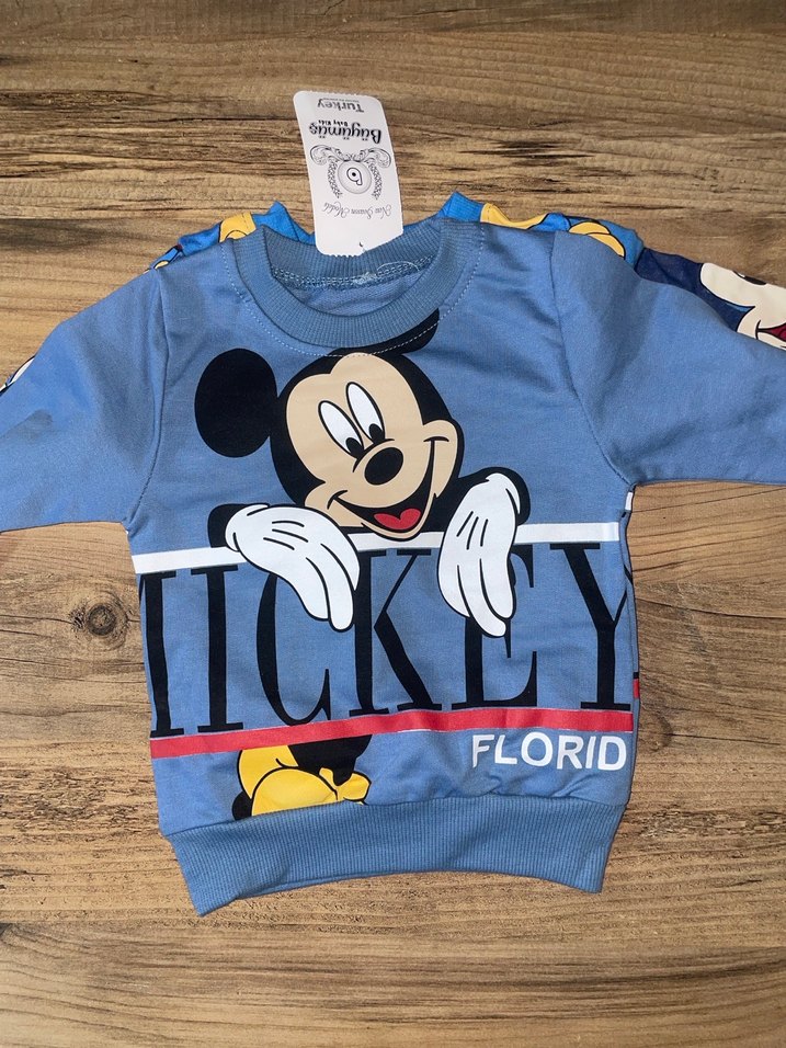 Mavi renkli, uzun kollu, yuvarlak yaka erkek sweatshirt. Mickey Mouse baskılı ve düğmeli detaylara sahip. Pamuklu kumaştan, rahat bol kesim. 2-3 yaş.