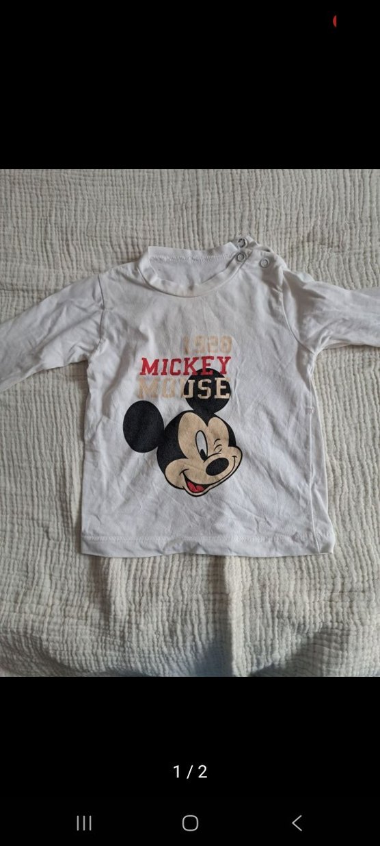 Pamuklu, uzun kollu, beyaz erkek tişörtü. Mickey Mouse baskılı, rahat kesim, yuvarlak yakalı ve omuzda düğmeli. 9-12 ay yaka kısmında hafif swrılık var