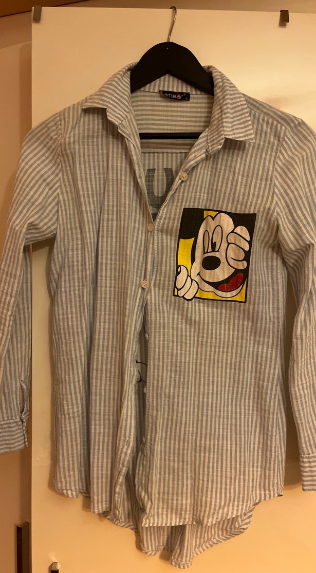 Ambar marka Düğmeli, uzun kollu ve normal boyda mavi çizgili kadın gömlek. Göğsünde ve sırtında mickey mouse baskılı bir detay bulunur, rahat kesimlidir.