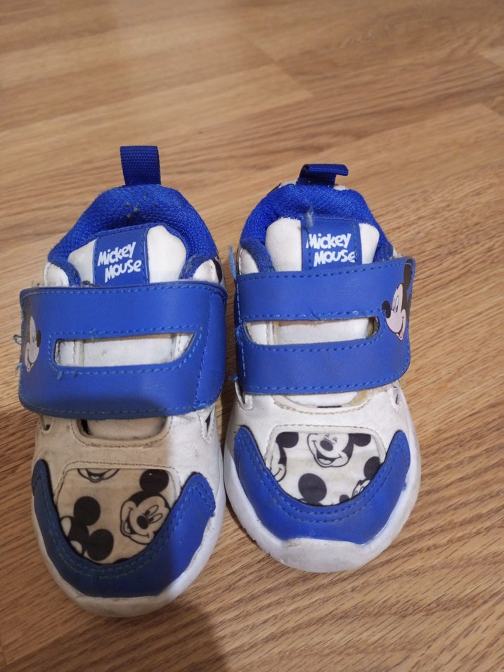 Mavi renkli, Mickey Mouse baskılı, kaymaz tabanlı ve cırt cırtlı erkek çocuk spor ayakkabısı. Rahat ve günlük kullanıma uygun.