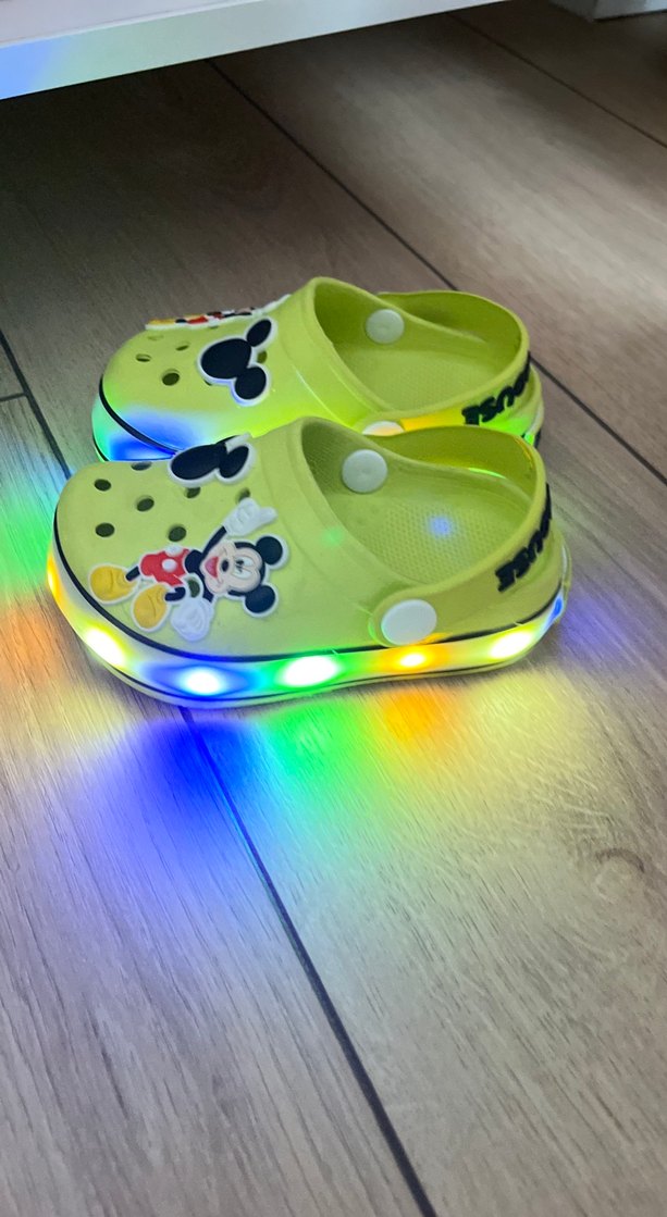 Mickey Mouse baskılı. Kauçuk malzemeden üretilmiş ve çok renkli ışıklı tabana sahip.
