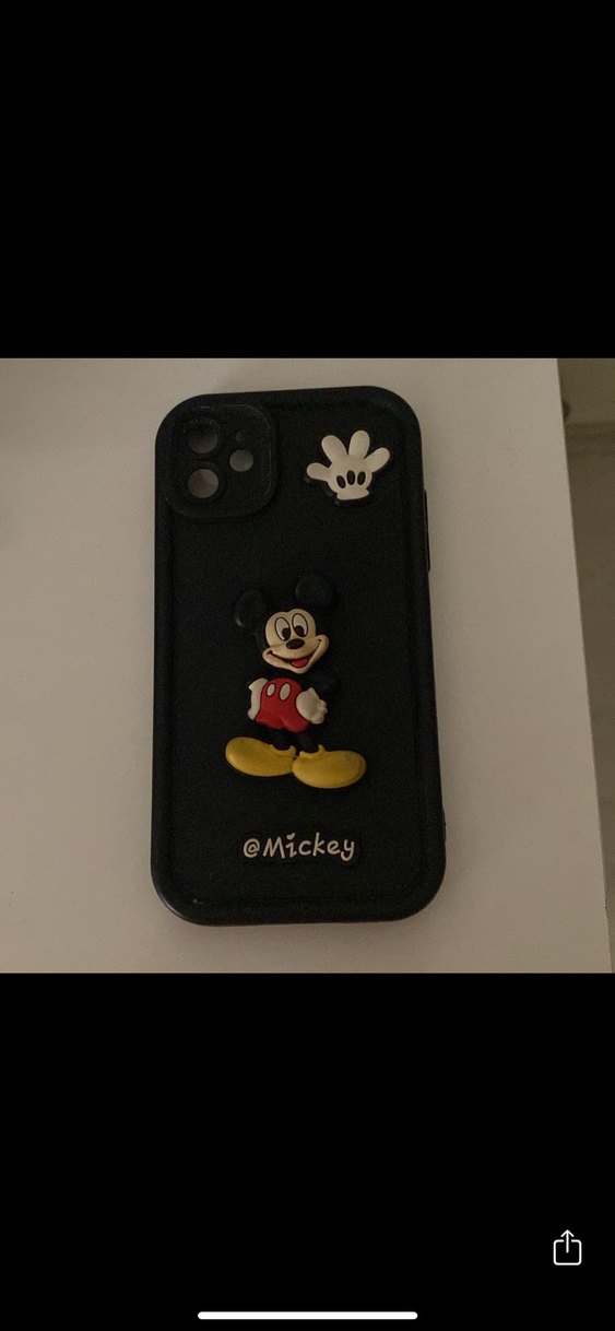 Parlak siyah telefon kılıfı, pop kültür Mickey Mouse figürü ve el simgesiyle süslenmiştir, '@Mickey' yazısı bulunmaktadır.