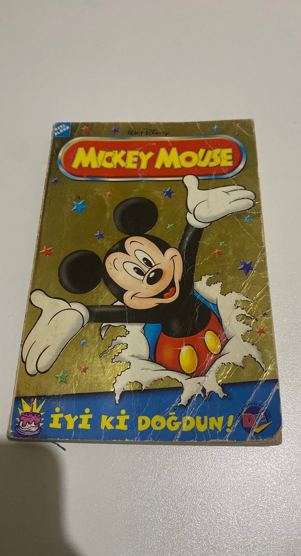 Mickey Mouse'un doğum günü temalı çocuk kitabı, renkli yıldızlarla süslenmiş kapak ve 'İyi Ki Doğdun!' başlığı içerir.