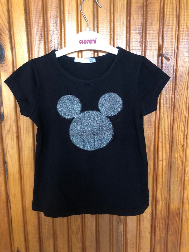 acar kids marka siyah renkli kısa kollu önü Mickey Mouse gümüş renk kumaşlı likralı 2-5 yaş kız çocuğuna uygun tişört koltukaltı ölçüsü 30 cm boy 38 cm