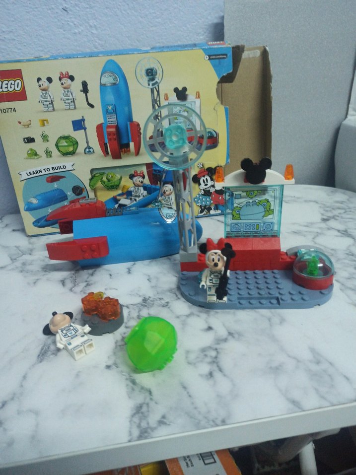 Mavi Lego seti, uzay roketi, ekranlı kontrol kulesi ve astronot figürleri içerir. Mickey Mouse benzeri karakter ve çeşitli aksesuarlarla hayal gücünü destekler.