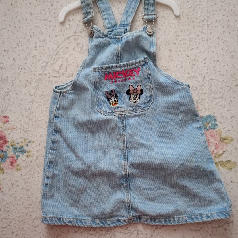Kızlar için fitted kesim kot elbise, askısız ve düğmeli detaylıdır. Ön cepten Mickey ve Minnie nakışlı, trend günlük stil için uygundur.