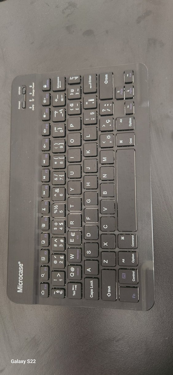 Microcase siyah kablosuz klavye, koyu renk tuşlar ve beyaz yazılarla kompakt bir düzen sunar. Standart tuşlar ve fonksiyon kısayolları içerir. ⌨️