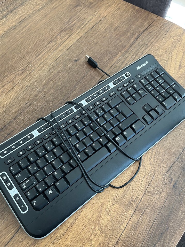 Microsoft marka siyah kablolu klavye, tam tuş takımı ve ek kısayol tuşları ile donatılmıştır. USB bağlantılıdır. ⌨️