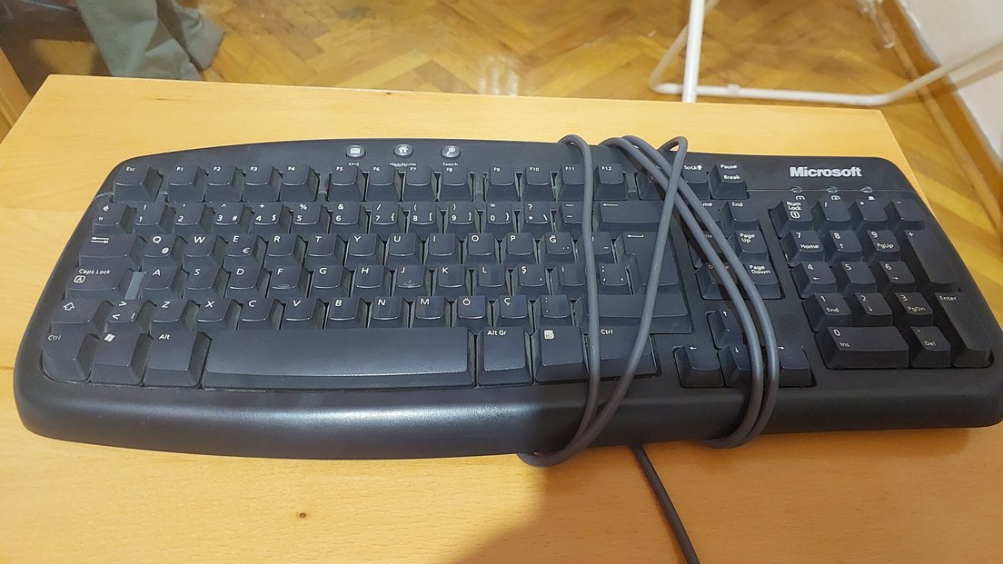 Standart tuşlara ve fonksiyon tuşlarına sahip gri kablolu klavye. Sayısal tuş takımı ve rahat bir bilek desteği içerir. calisiyor.