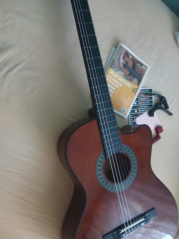 Gitar yenidir alalı 2 ay oldu çizik yok tellerin hepsini yeni değiştirdim. Yanında pena kapo akort ses cihazı ve gitar eğitim seti hediyedir