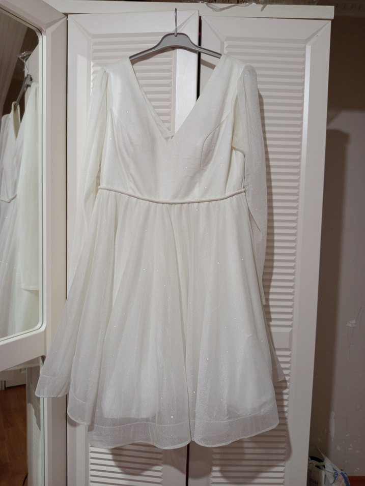 Bu beyaz mini gelinlik, V yaka ve uzun kollara sahip, bol kesimdir. Vintage ve modern klasik stilin birleşimiyle düğünler için uygundur. Midi boyu ve hafif kumaşıyla zarif görünür.