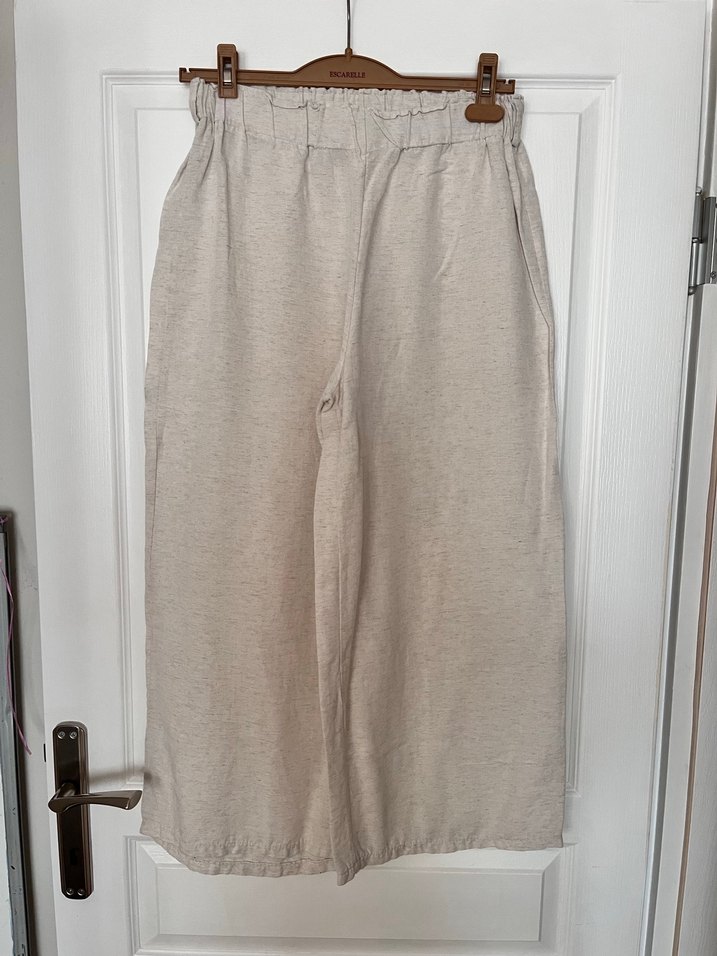 Bej renkte bol kesim ve midi boy kadın pantolon. Desensiz, minimal ve normcore tarzıyla günlük kullanıma uygun.