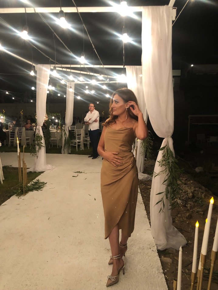 Midi boy, vücuda oturan elbisesi, straplez yaka ve drapeli tasarıma sahip. Yağ yeşili renginde, ipeksi kumaştan, askılı kollu ve çağdaş tarzda, düğün için uygun. ✨