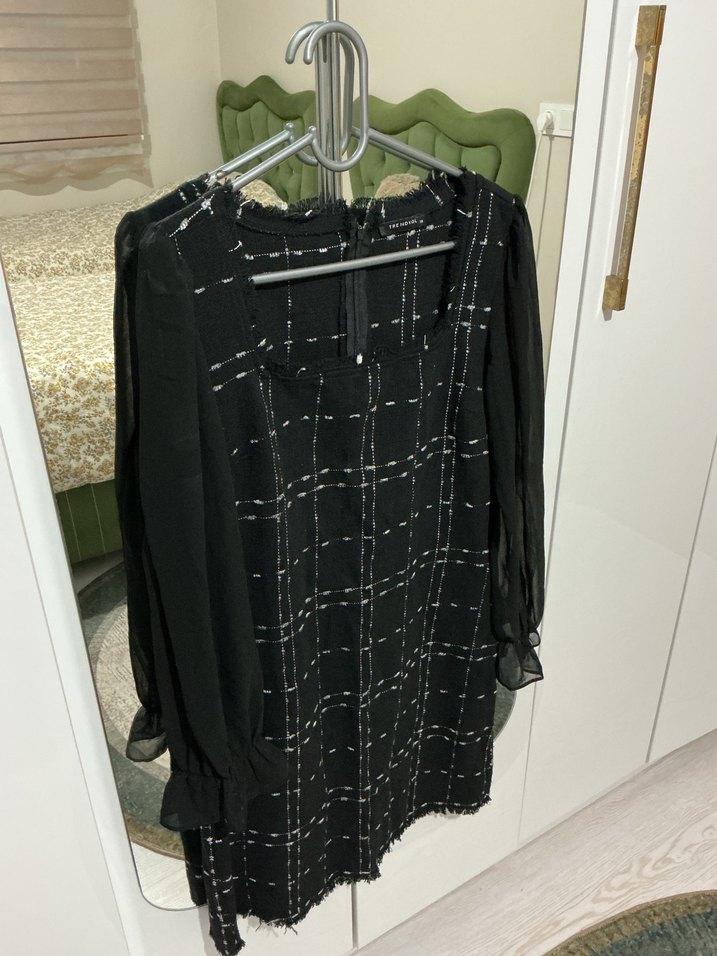 Kolları tül detaylı kumaşı kalın elbise