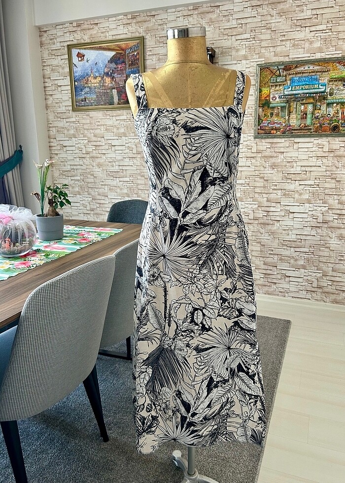 Kendi tasarımım ve dikimim olan midi boy elbise. Üst bedeni iki kat kumaştan dikilmiştir. Askılı ya da askısız olarak kullanılabilir. Arkasında basene kadar açılabilecek gizli fermuarı mevcuttur. Tek taraflı siz üstüne kadar yırtmacı bulunmamaktadır. 1 defa giyilmiştir.