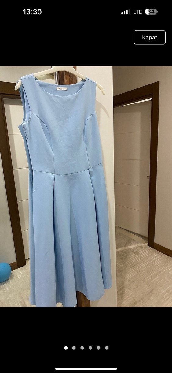 Pastel mavi renkte, kolsuz ve V yakalı midi elbise, pile detaylı etek kısmı ile modern klasik bir ofis şıklığı sunar.birkaç yerinde minik delikler var o yüzden fiyatını uygun tutuyorum