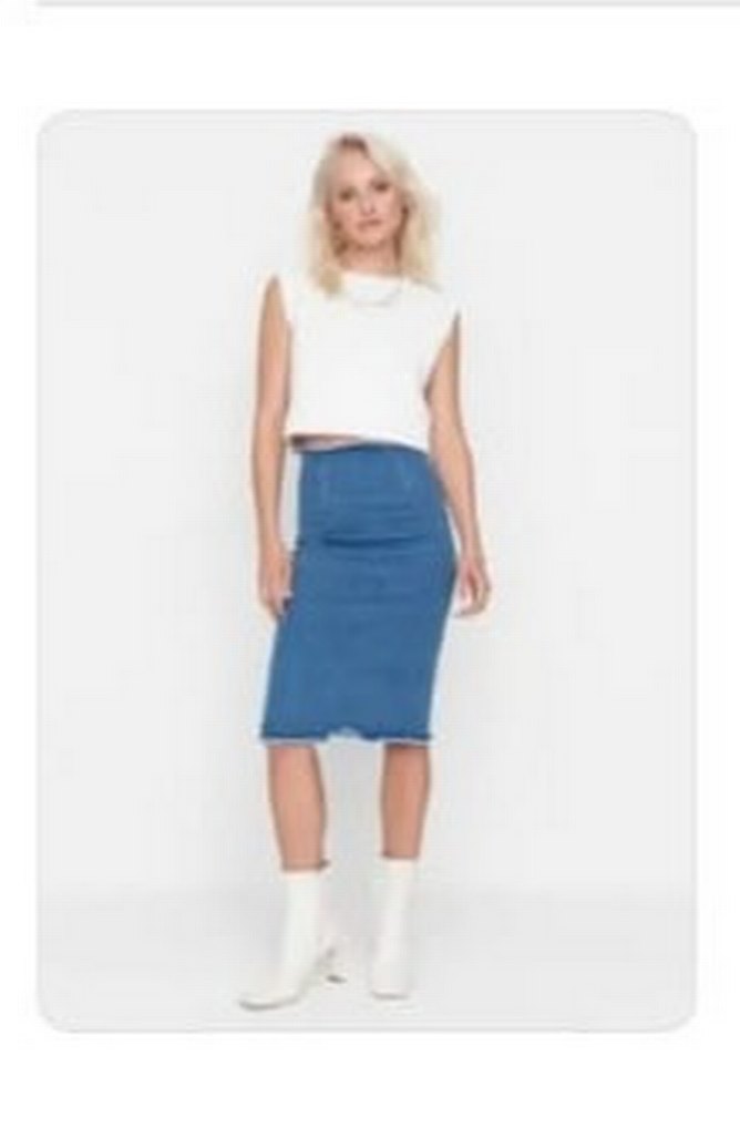 Fitted kesim midi denim etek, günlük kullanıma uygun rahat ve şık bir görünüm sunar.