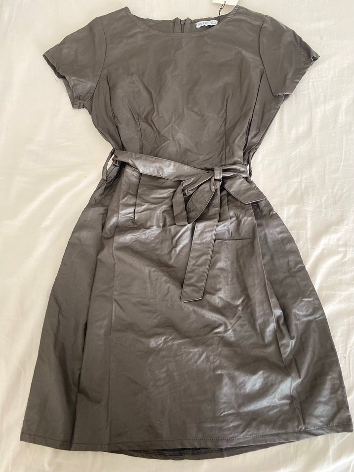 Kahve midi deri elbise, kemerli ve cepli