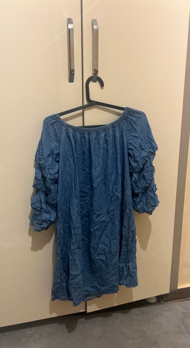 Denim kumaştan, fırfırlı uzun kollu ve straplez yakalı, bağlama desenli mavi-gri midi elbise. Rahat ve trend günlük stil için uygundur.