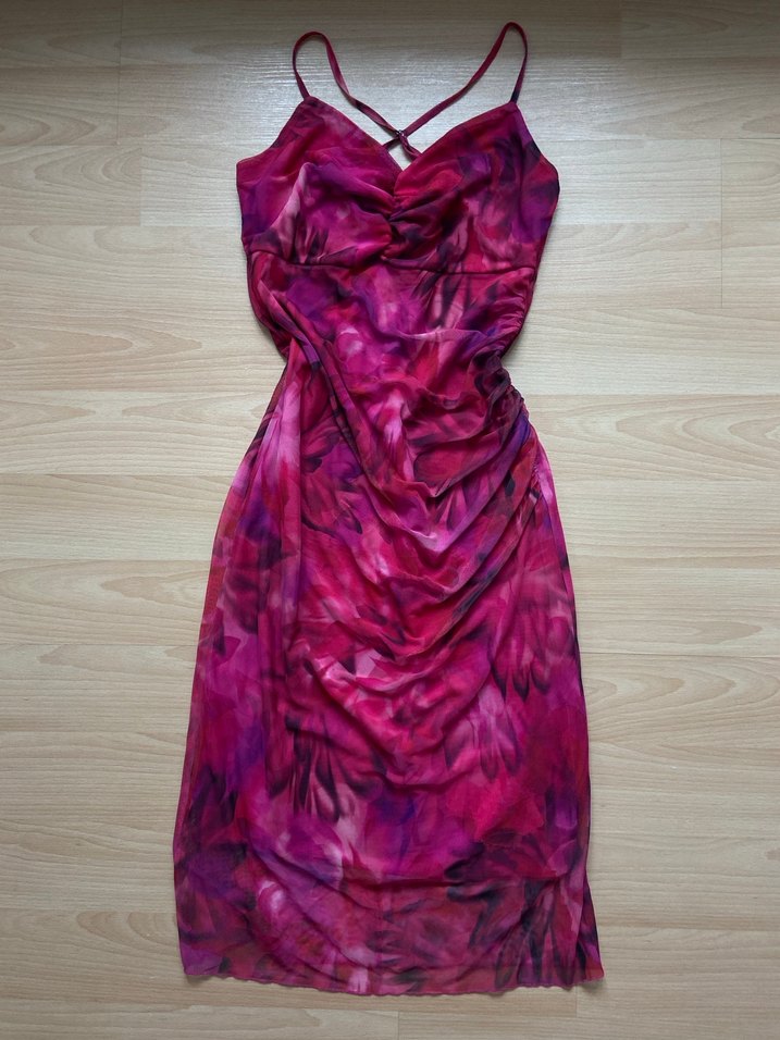 Desenli, askılı midi elbise. Yaz aylarında şık bir görünüm için ideal. L/40 bedene uygundur