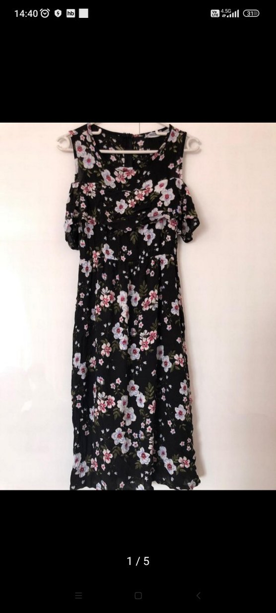 Midi boy siyah elbise, çiçek desenli, fırfırlı ve omuz tasarımıyla bol ve rahat bir kesime sahiptir.