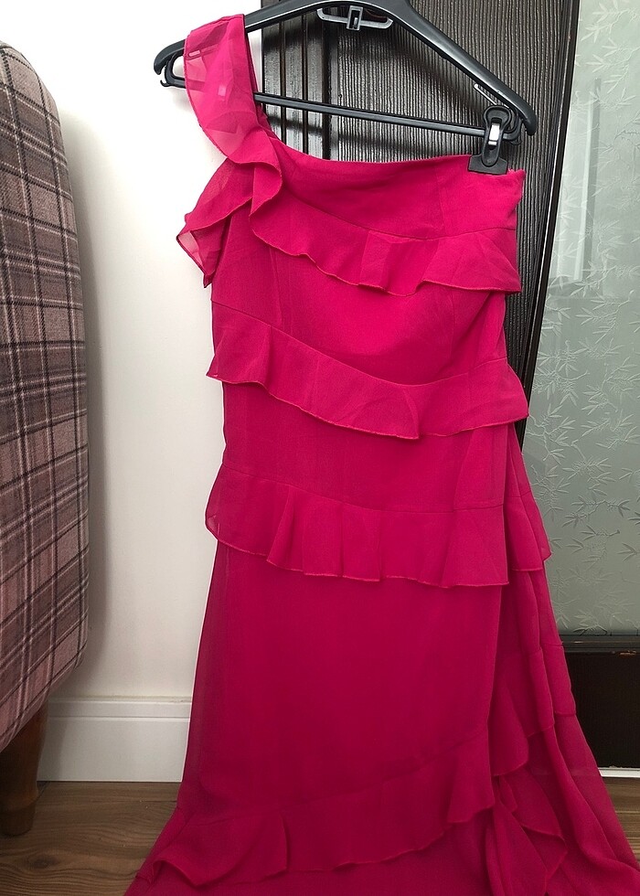 Fuşya astarlı, yandan yırtmaçlı maxi elbise. Hiç kullanılmadı.