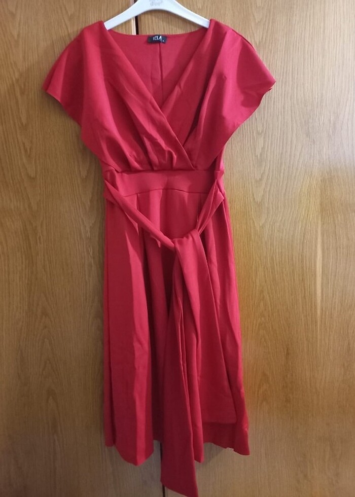 Eteği A kesim, kruvaze yaka, kuşaklı, kırmızı, midi boy Sorunu yok Sadece 1 kere düğünde giyildi Marka temsilidir