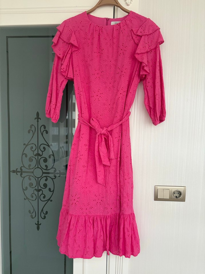 Pembe renkli, fırfırlı detaylara sahip uzun bohem elbise. Sentetik kumaştan, rahat kesim, yuvarlak yaka ve nakışlı desenlidir. Günlük kullanıma uygundur.