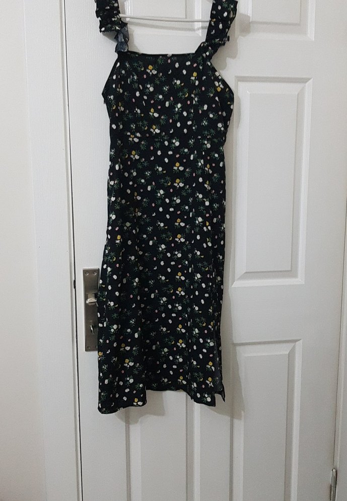 Midi Elbise, Fırfırlı, Siyah Çiçek Desenli