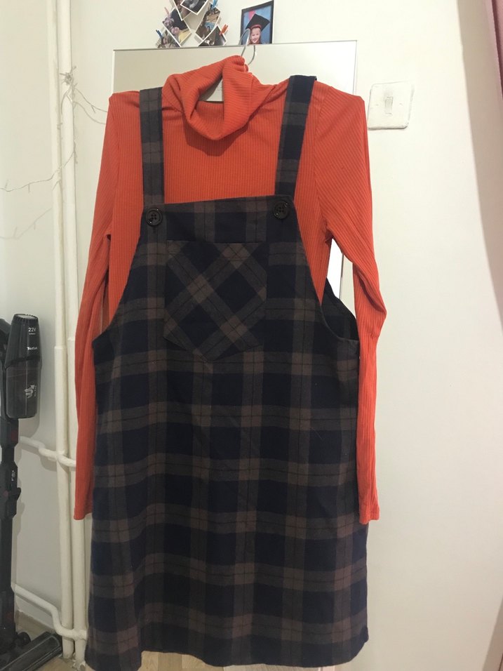 Ayarlanabilir askılı, ön cepli ekoseli günlük kullanıma uygun elbise ve boğazlı badi S/M uyumlu