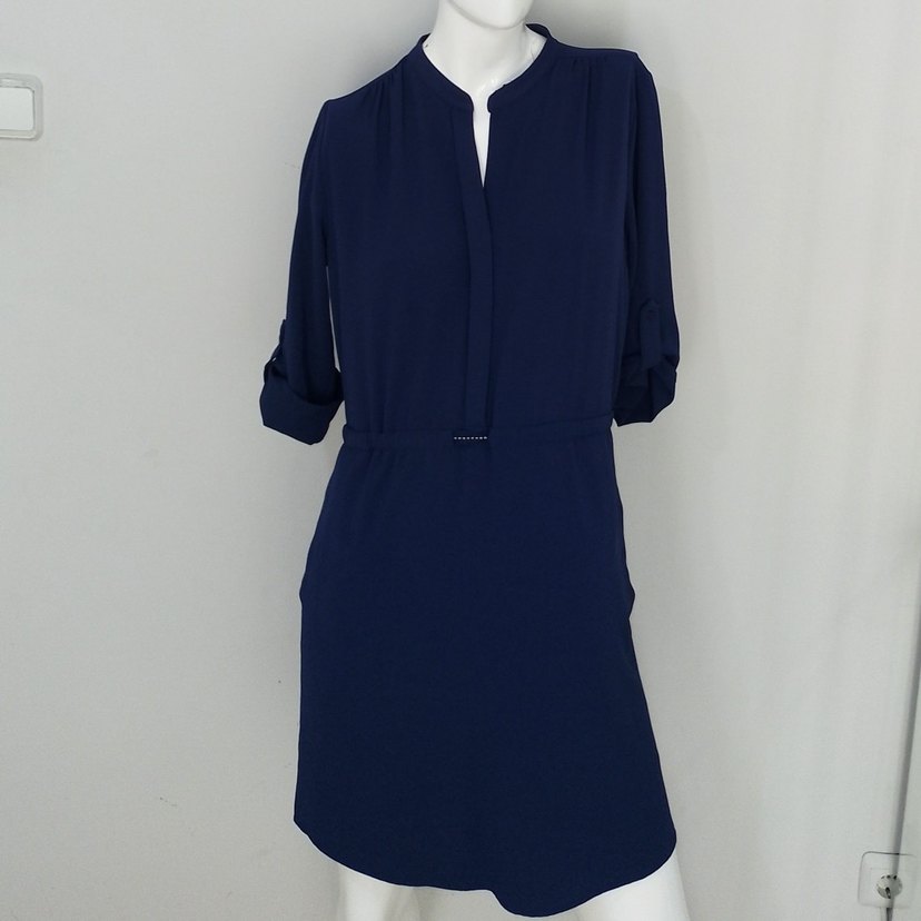 bir kol altından diğer kol altına ölçü: 49cm, yani toplam 98cm. boydan uzunluğu: 89cm. beli bir uçtan bir uca: 43cm, yani toplam 86cm. omuzdan itibaren kol uzunluğu: 43cm. v yaka, fakir kol (3/4 kol), beli ipli, önü düğmeli, koyu lacivert elbise. 7. fotoğraftaki gibi kumlu bir kumaşı var. sıfır gibi, yepyeni. sorunsuz, temiz ürün. diğer ilanlarıma da bakın