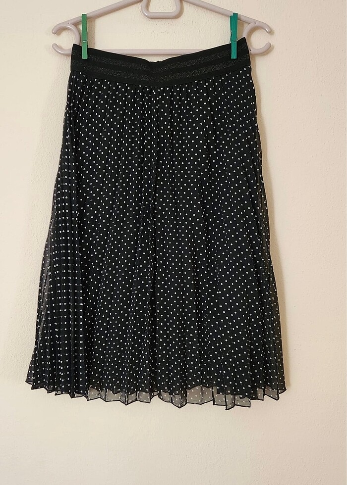 Puantiyeli pileli beli lastikli midi etek