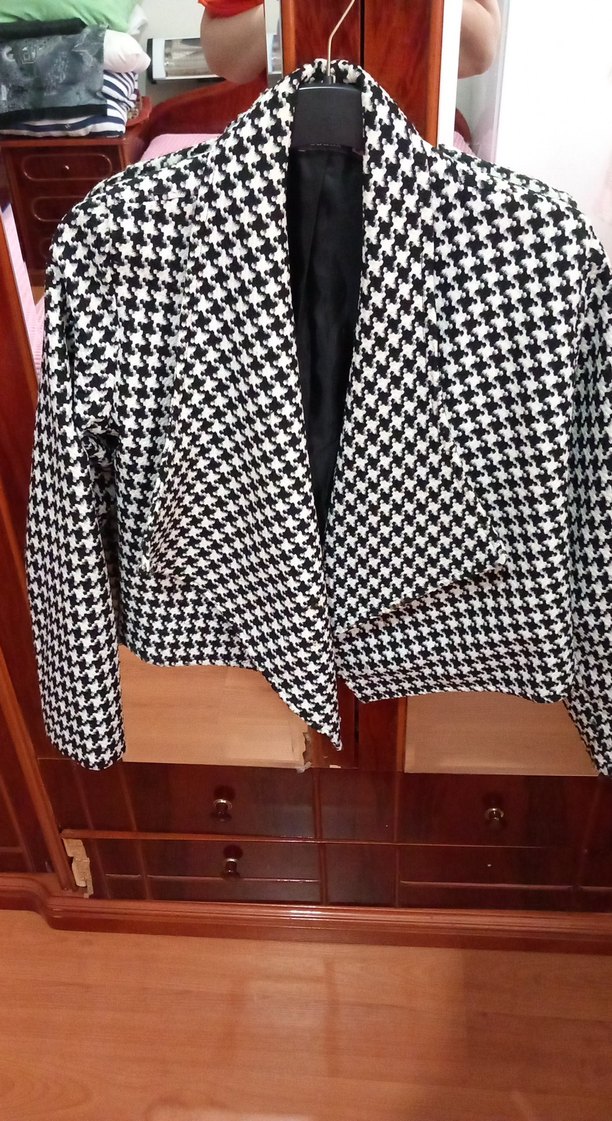 , notched lapel yakalı siyah beyaz kadın ceke uzun kollu, midi boy, regular fit ve klasik siyah beyaz kazayağı deseniyle ofis için uygun.