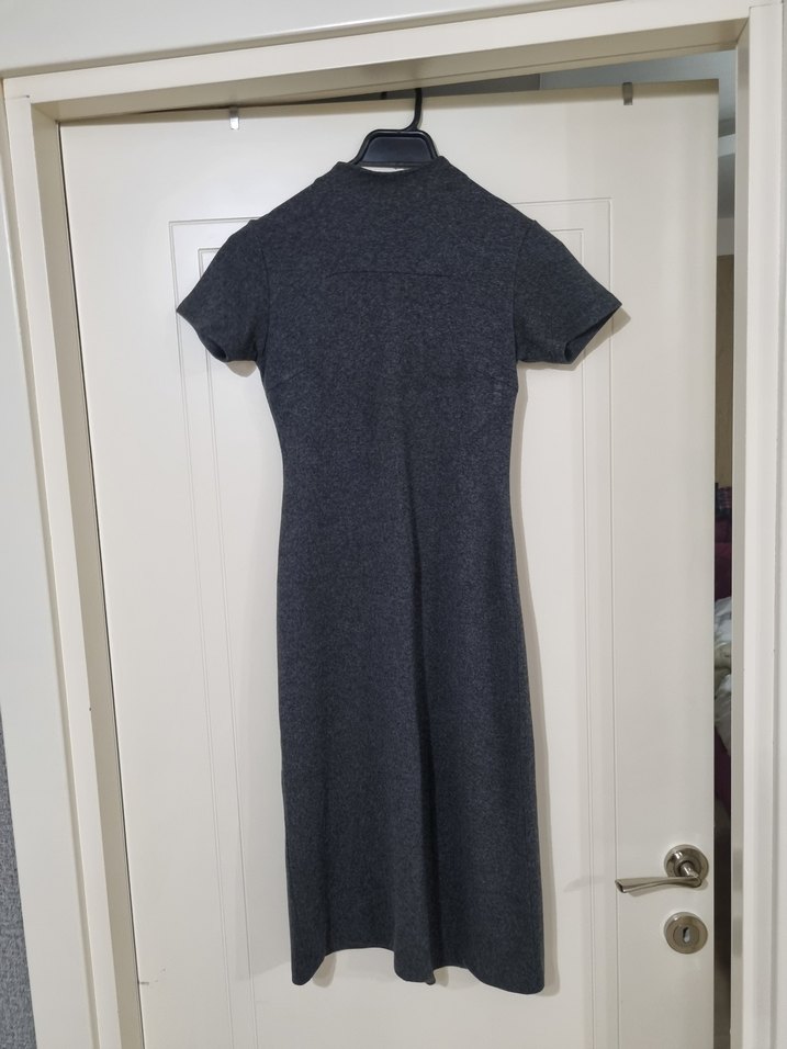 Polo garage, 1 numara yani en kucuk beden, koyu gri midi elbise, yarım balıkçı ve kısa kolludur.