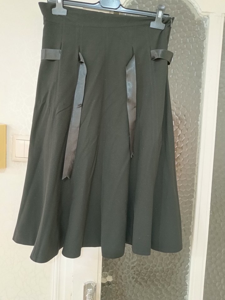 Siyah midi uzunlukta, kemerli ve gevşek kesime sahip kadın eteği. Sentetik kumaştan üretilmiştir. Birkaç kere giyildi. Rengi fotoğrafta soluk duruyor normalde çok canlı. 38 bedendir. Marka temsilidir