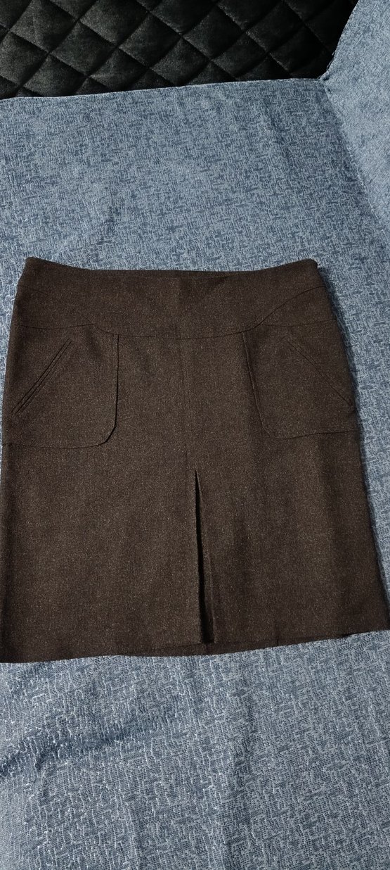 Füme kırçıllı etek, normal kalıp ve midi boydadır. Kemerli bel ve ön yırtmaç detayına sahiptir, ofis kullanımı için uygundur. Deformasyon yoktur. Bel: 40 Basen:46 Boy: 50 #midietek