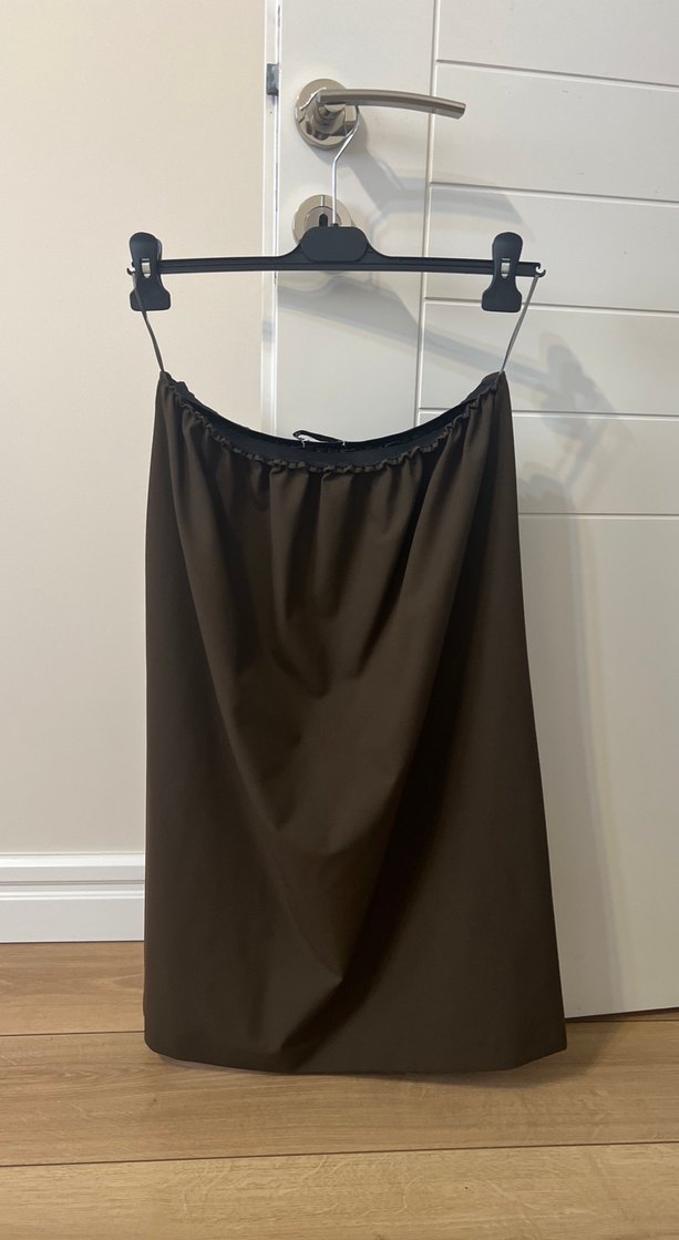Kahverengi midi uzunlukta, bol kesim kadın eteği. Pürüzsüz sentetik kumaştan üretilmiş, minimal tarzıyla günlük kullanıma uygundur.
