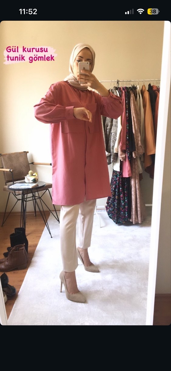 Pastel pembe midi tunik, yakalı ve uzun kolludur. İpek gibi yumuşak kumaştan, rahat ve salaş kesimle günlük ofis şıklığı sağlar. Pamukludur