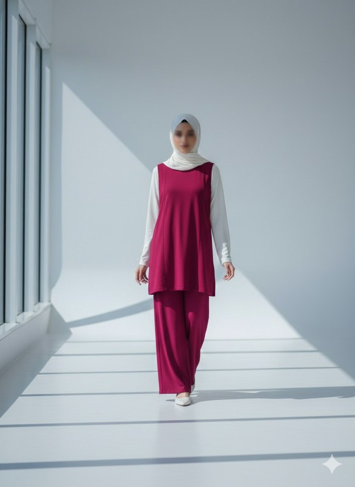 fuşya renkte, yüksek yakalı ve kolsuz, salaş kesime sahip kadın takımı. İpeksi kumaştan üretilmiş, gündelik kullanıma uygun, sade ve şık görünümlü.